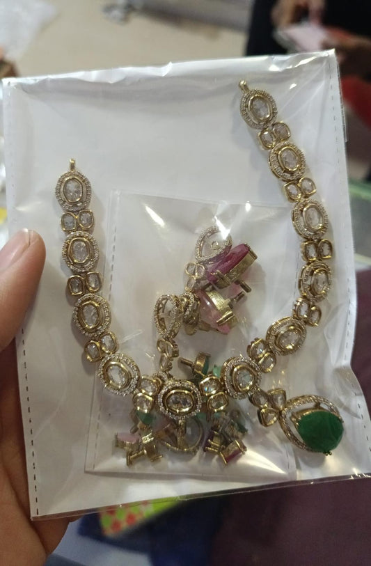 Glamorous Bridal Polki Kundan Jewelry Reversible 2in1 Premium Quality Necklace with Monalisa Beads