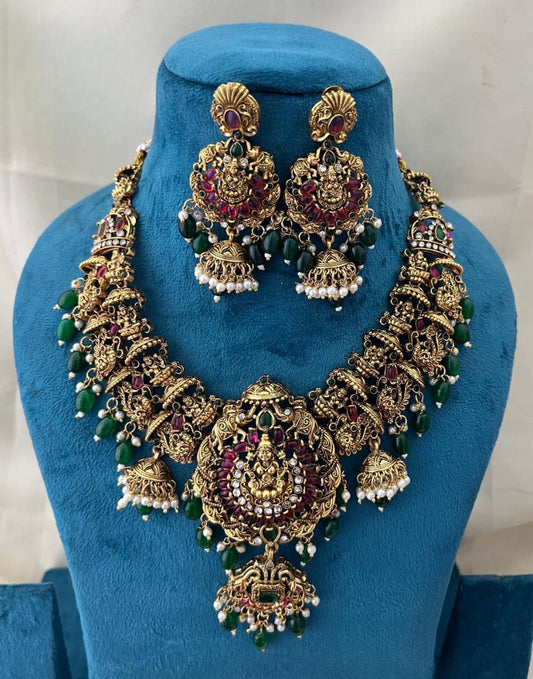 Beautiful Matte Finish Temple Bridal Set With Earrings - Lakshmi Motif