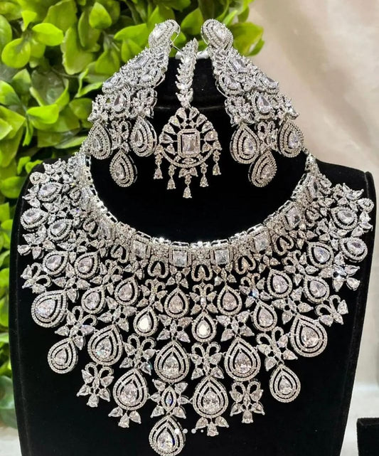 Unique CZ Stone Bridal Choker Necklace with Earrings and Tikka -Silver and RoseGold polish