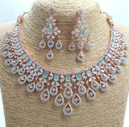 Beautiful American Diamond Stone Choker Necklace Set With Earrings - Rose Gold Polish