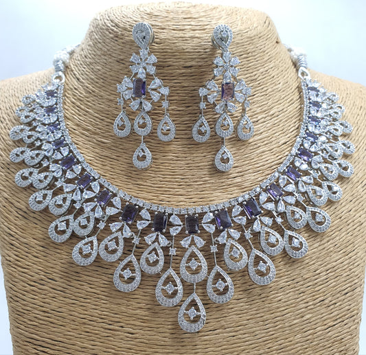 Beautiful American Diamond Stone Choker Necklace Set With Earrings - Silver Finish