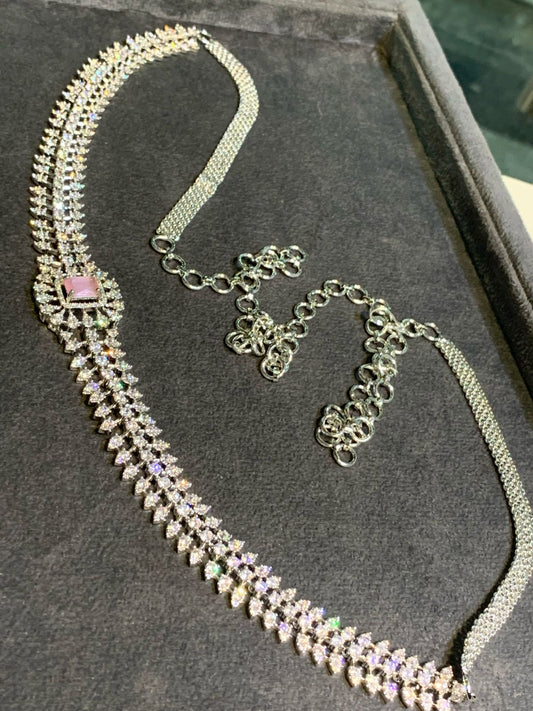 Amazing Two Layered CZ Stone Premium Silver Finish Necklace Set With Earrings - Mint, Blue, Pink, Green, DarkPink