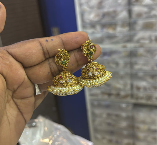Super Cute Matte Finish Stone Jhumkas Earrings - Peacock Motif