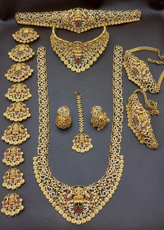 Premium quality Temple Jewelry CZ Stone Bridal Set Haram Necklace Set with Earrings Lakshmi Coin Design