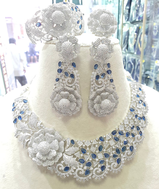 Grand Bridal Cz Stone Silver Necklace Set with Earrings, Bracelet and Ring