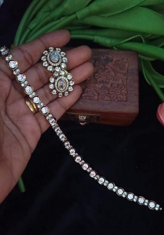 Beautiful American Diamond Necklace with Earrings and Tikka- Silver white