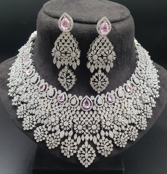 Latest Premium Bridal CZ Stone Silver Finish Necklace Set With Earrings