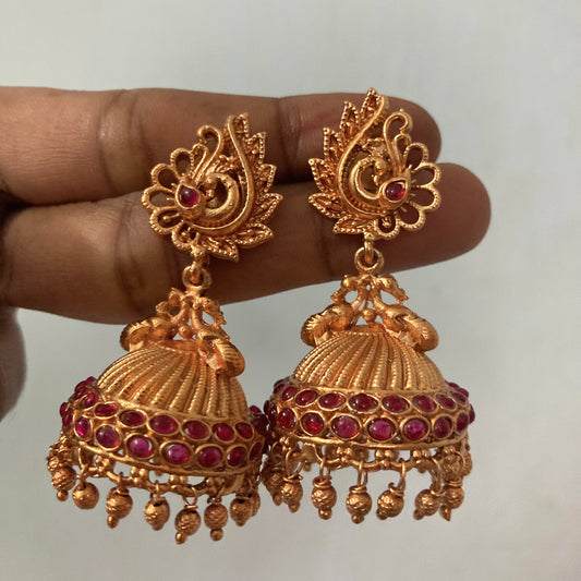 Bridal Matte Finish Jhumkas - Peacock Motif Earrings