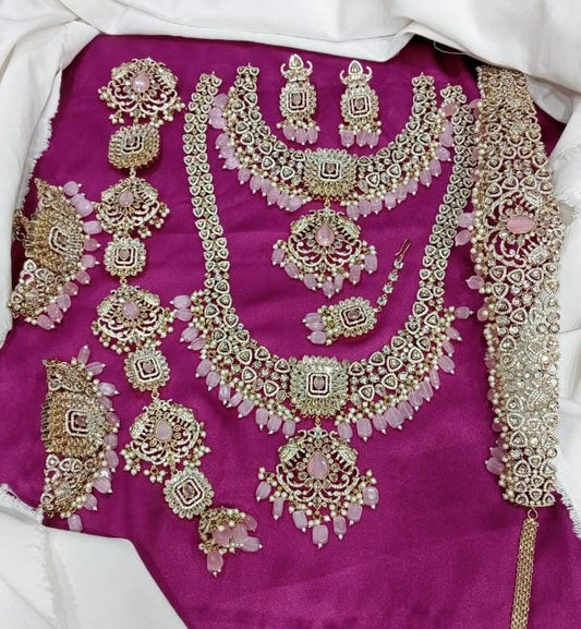 Elegant Victorian Finish Full Bridal Set Haram Necklace Set with Earrings -Pink