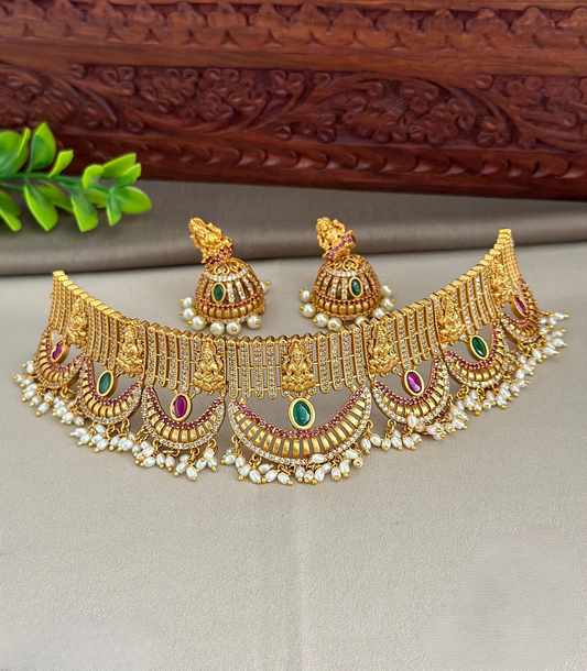 Premium Quality Partywear Bridal Lakshmi choker Necklace set- Temple jewelry