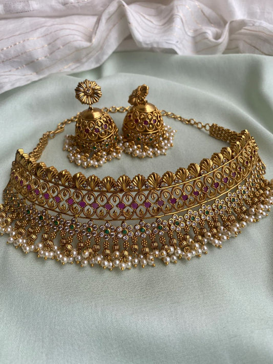 Elegant Premium Matte Finish Choker Necklace Jhumki Earrings