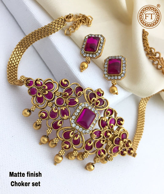 Cute and chick Matte finish mini choker necklace with Stud Earrings-Red