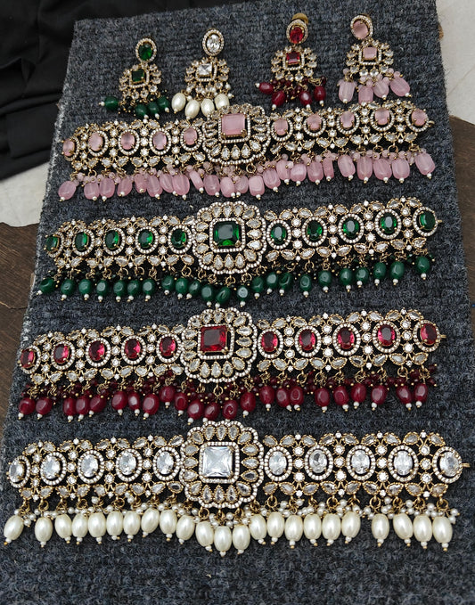 Elegant Victorian finish Cz Stone Choker Necklace with Earrings -1 Set- Pink, Green,Red,White