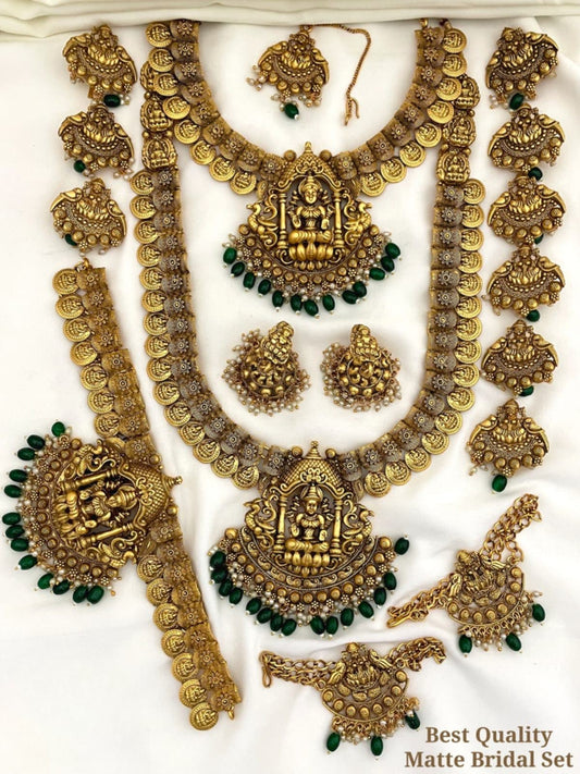 Beautiful Temple Jewelry Matte Full Bridal Set Haram Necklace Set with Earrings With kemp stones Lakshmi Motif
