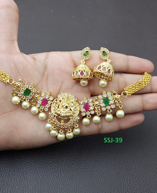 Traditional Temple Jewelry Matte Finish Lakshmi Choker Necklace Set with Jhumkas