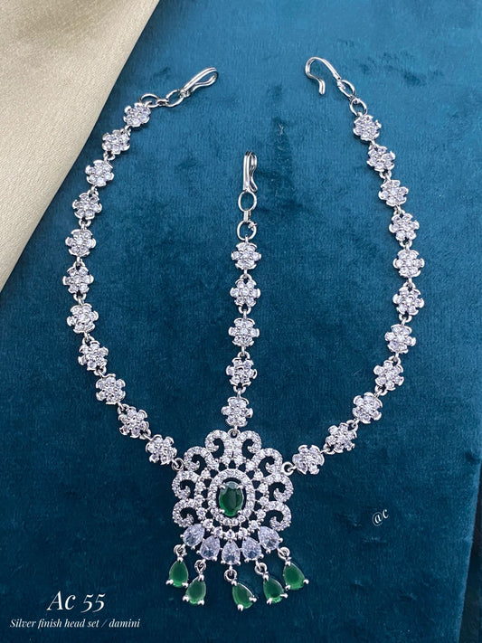 Elegant Bridal Silver Finish AD Stone Mathpati Tikkas