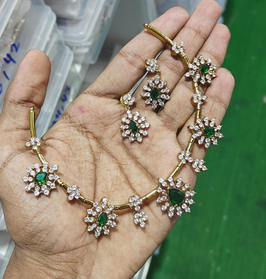 Beautiful American Diamond Necklace Set with Earrings-Green-Premium Finish