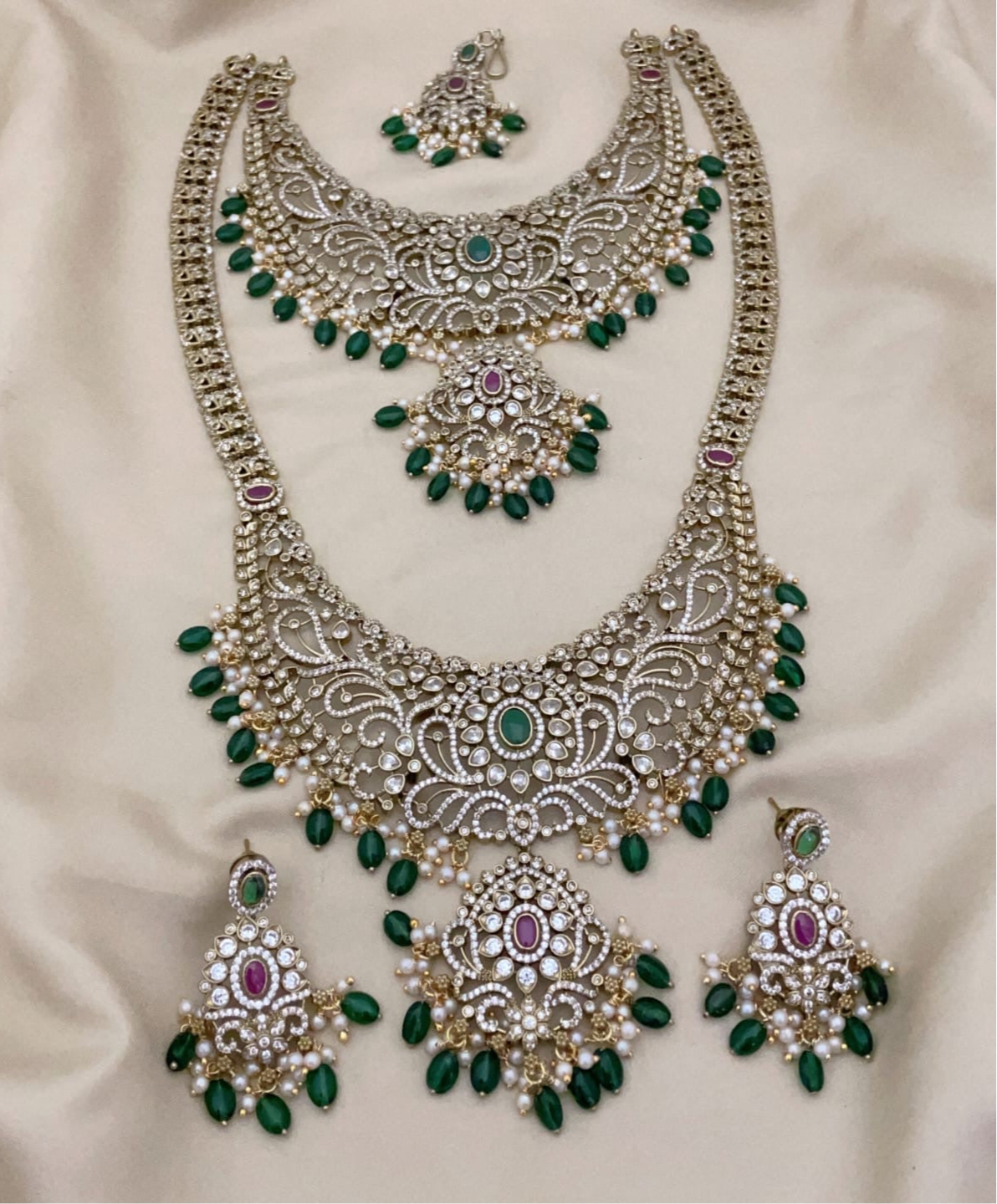 Beautiful Premium Quality GJ Polish CZ stone Bridal Set Haram Necklace Set with Earrings and Tikka -Green