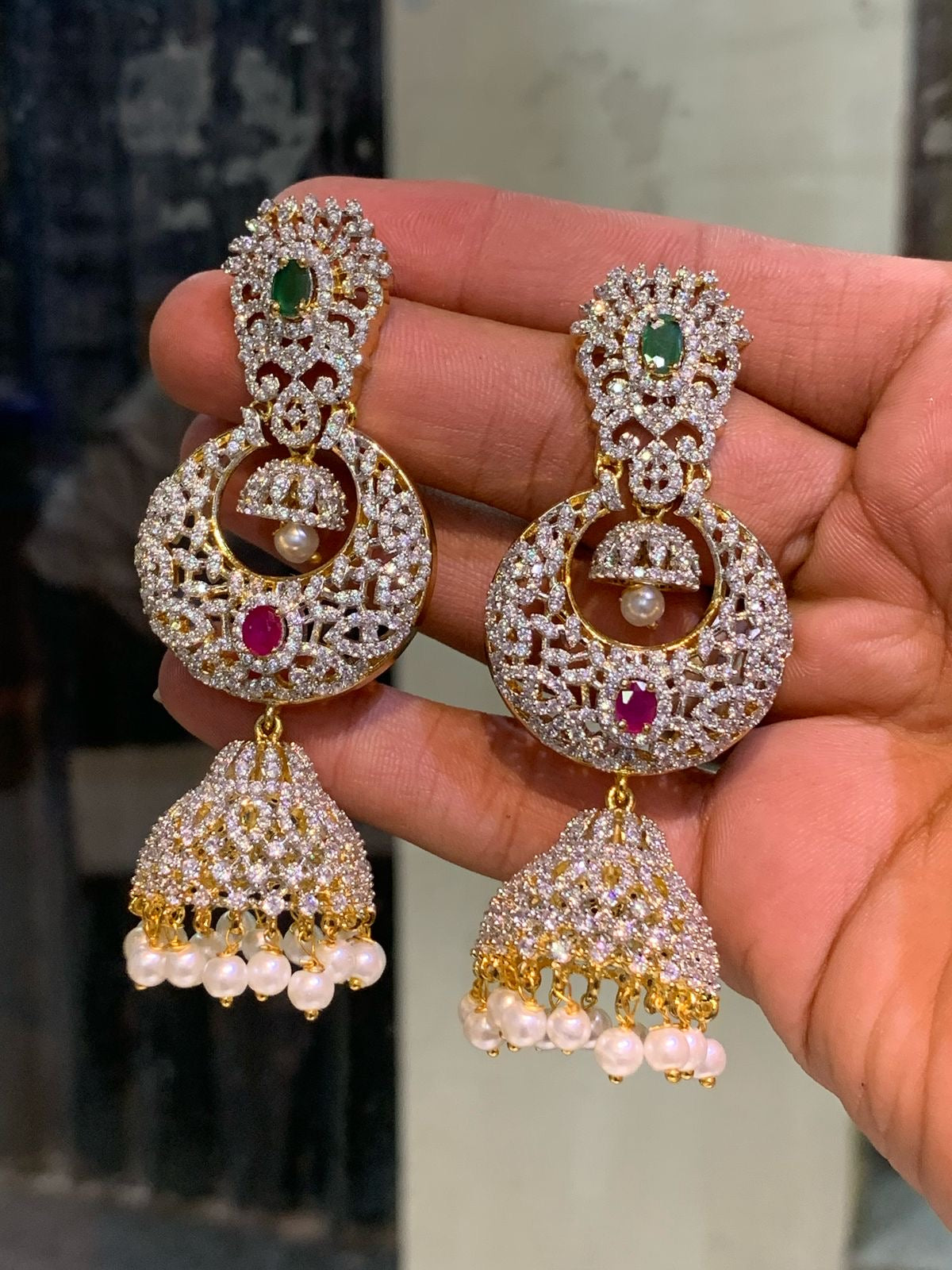 Super-cute Classy Cz stone Premium GJ polish Chandbali Jhumkas